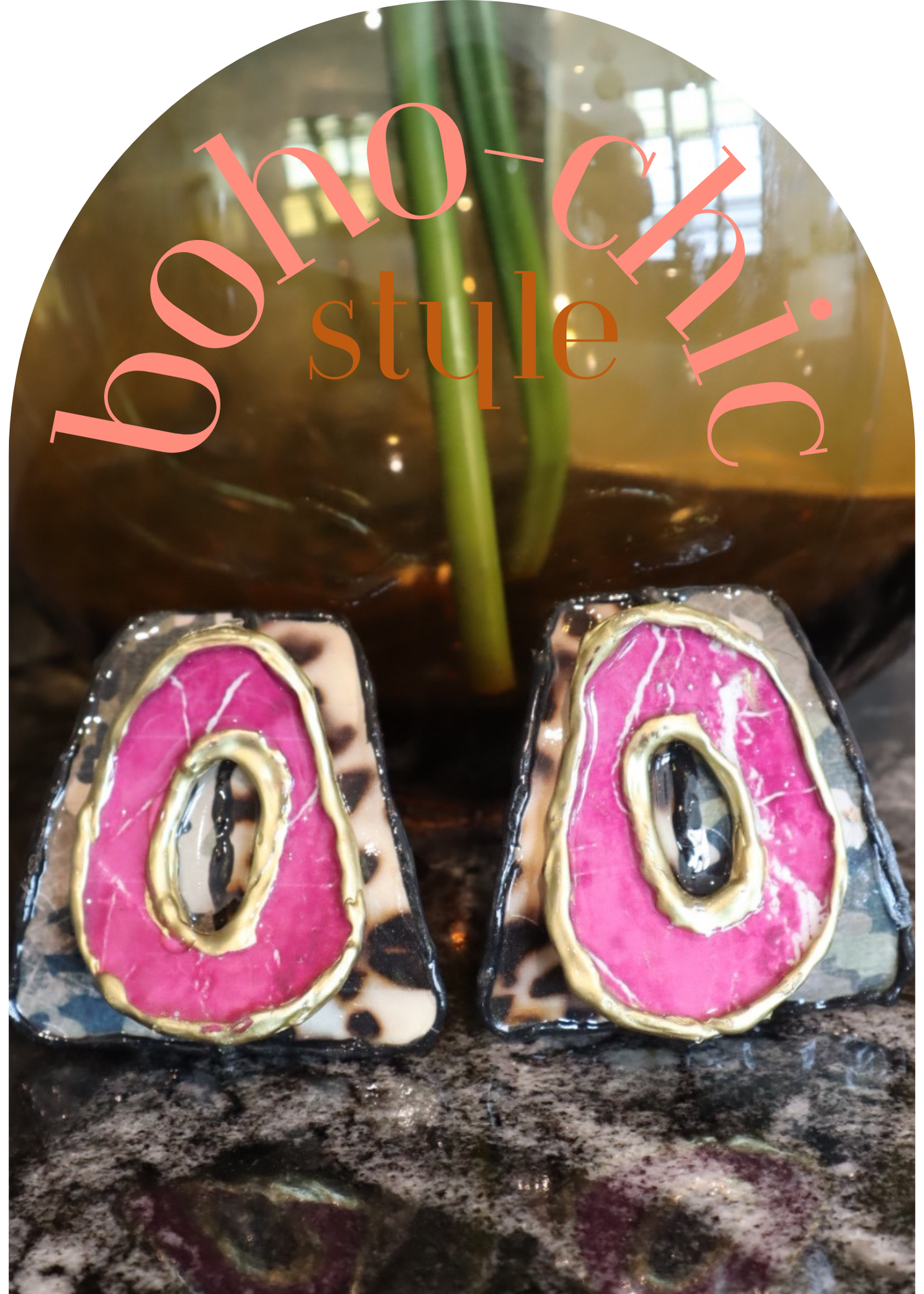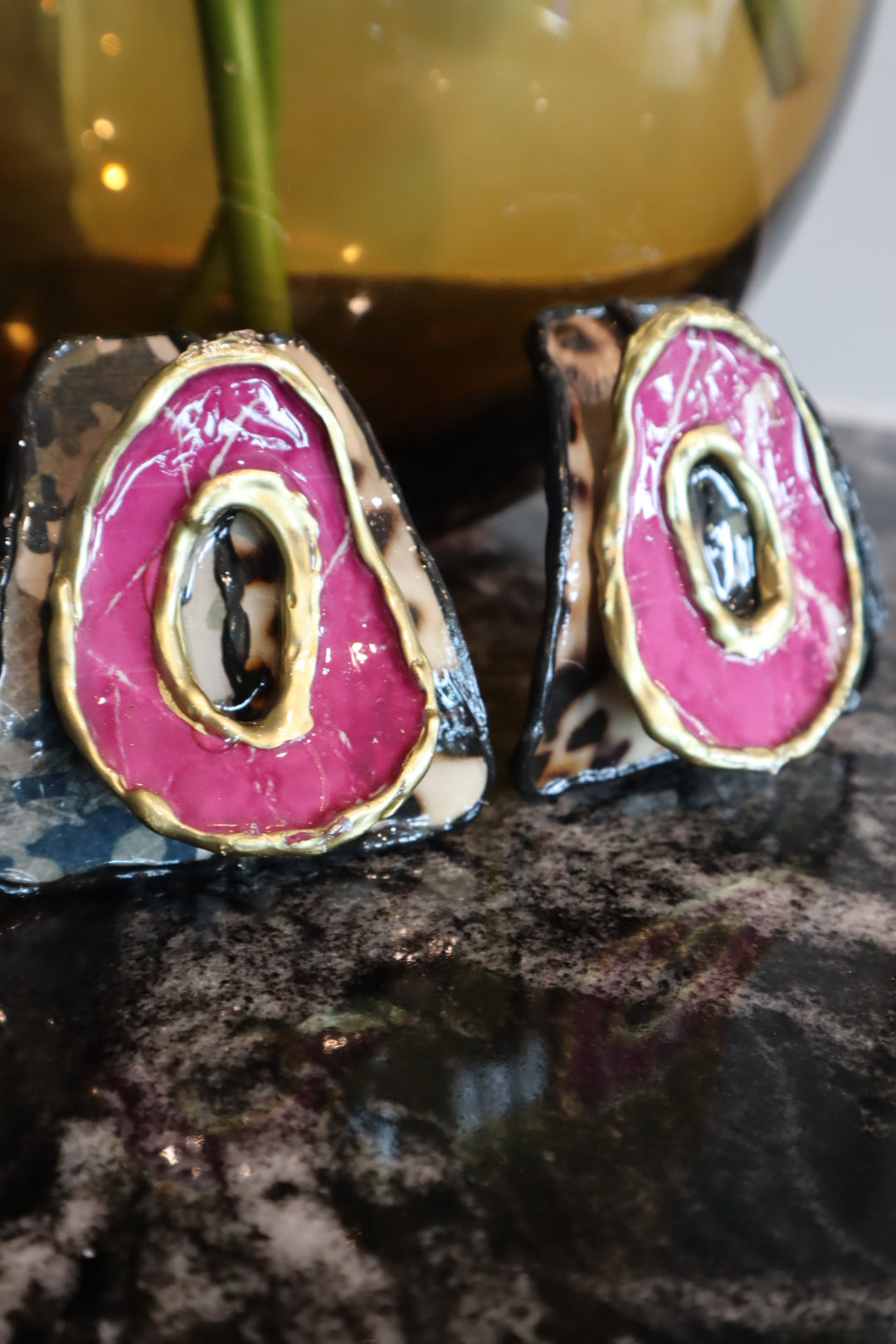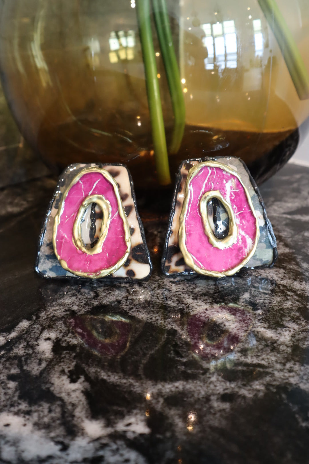 Bold contrast meets fearless color in this handcrafted statement pair. Featuring a rich maroon pink center, layered over tortoise shell and army fatigue patterns, and finished with sculpted gold accents, these earrings are wearable art with serious attitude.