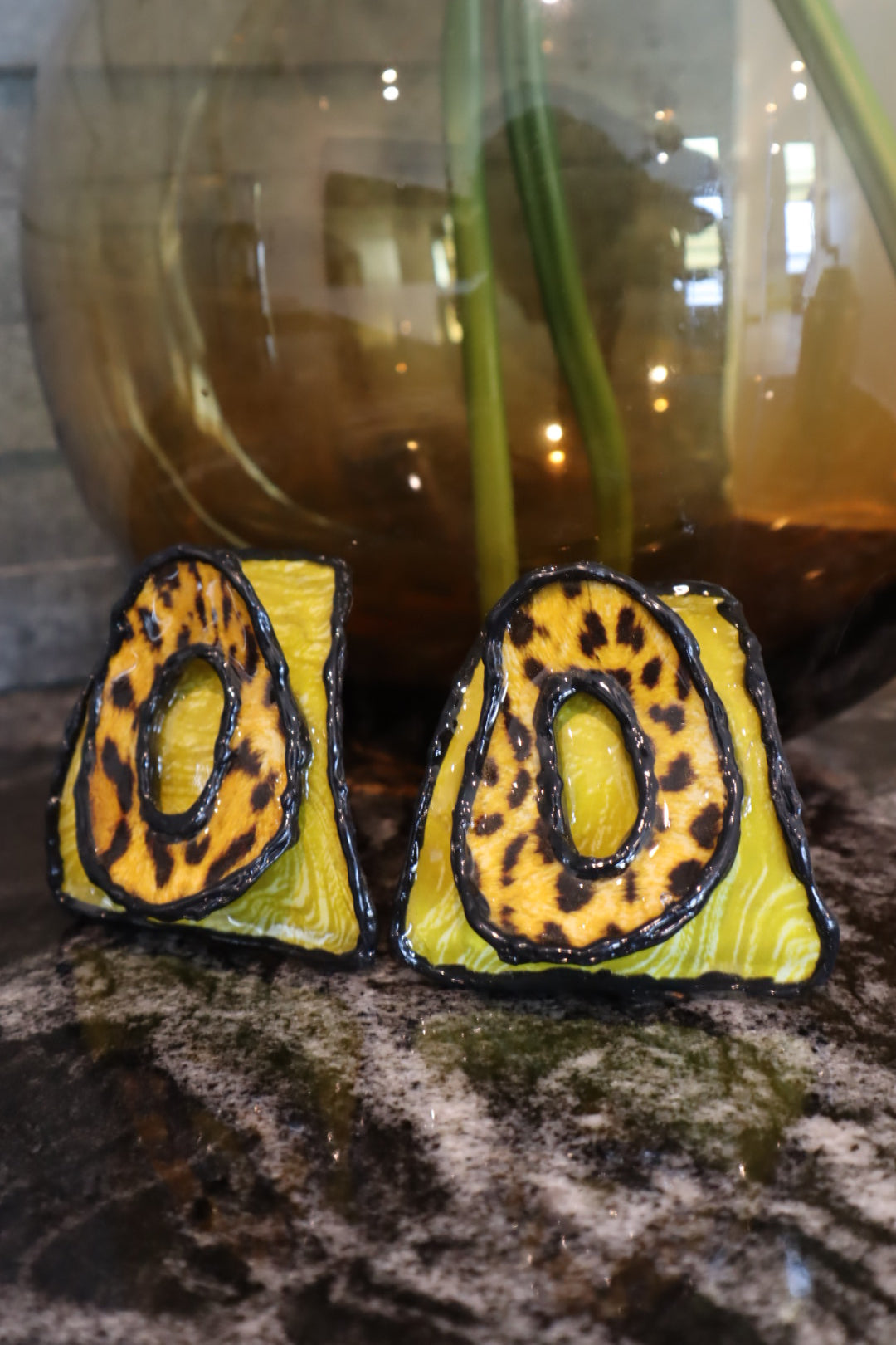 Wild meets electric in this fearless pair. These handmade statement earrings feature a vibrant chartreuse base layered with bold cheetah print, outlined in sleek black with luxe gold accents for a high-impact finish.